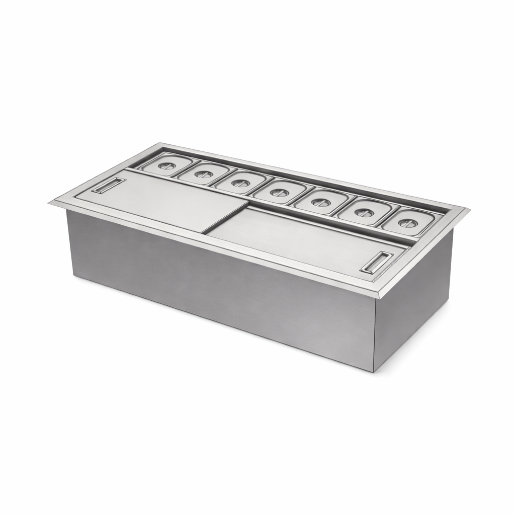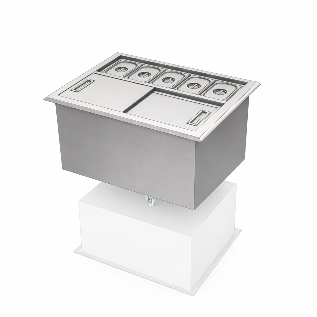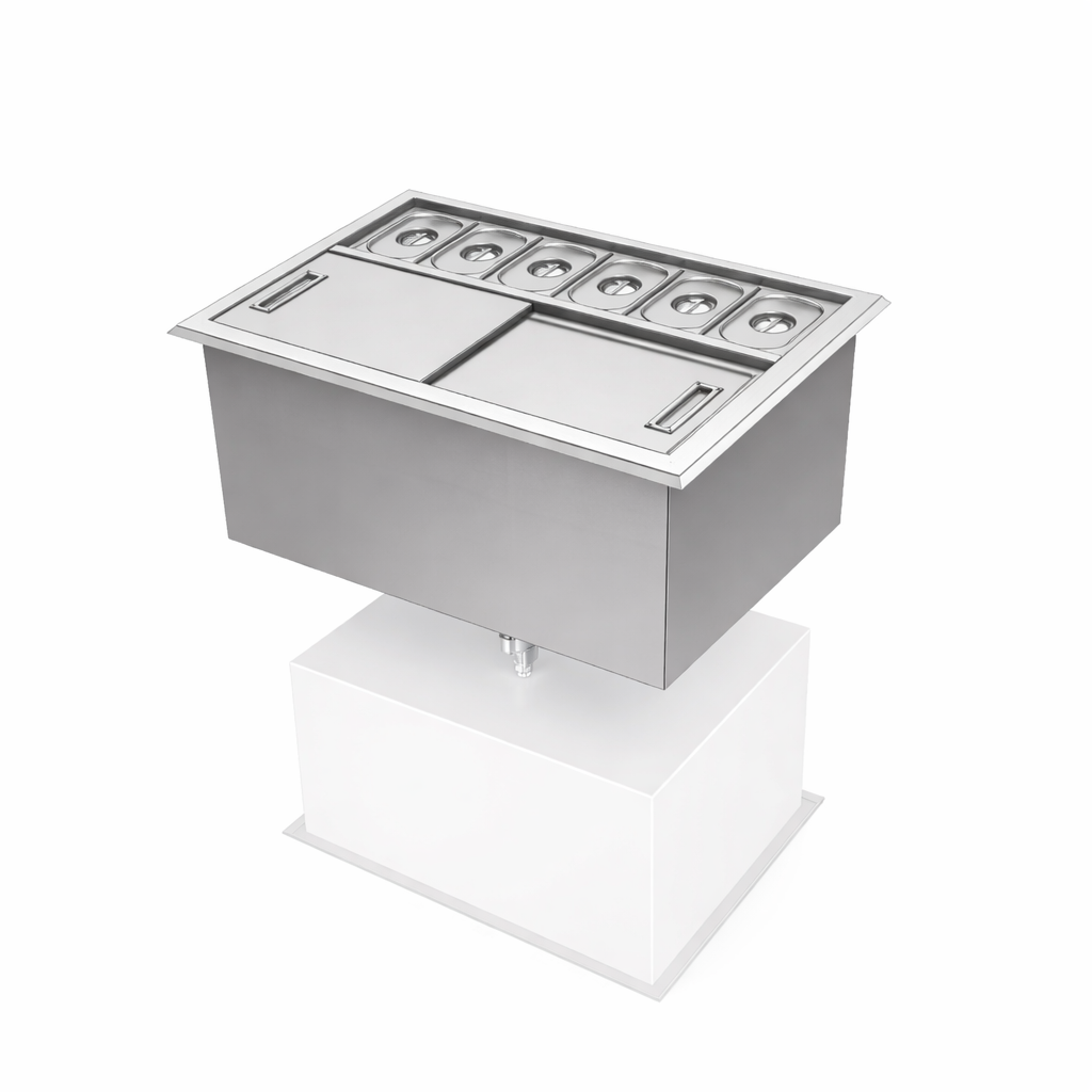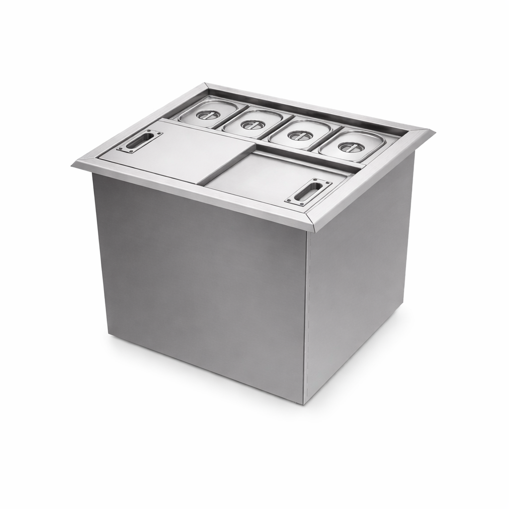 Thùng đựng đá âm bàn có khay thiết kế đa năng, tối ưu cho quán trà sữa, cafe, nhà hàng, quầy bar hoặc không gian kinh doanh đồ uống. Sản phẩm kết hợp 3 khay topping GN1/9 tiện lợi, giúp phân loại và bảo quản nguyên liệu lạnh, đá viên, topping một cách khoa học và gọn gàng.